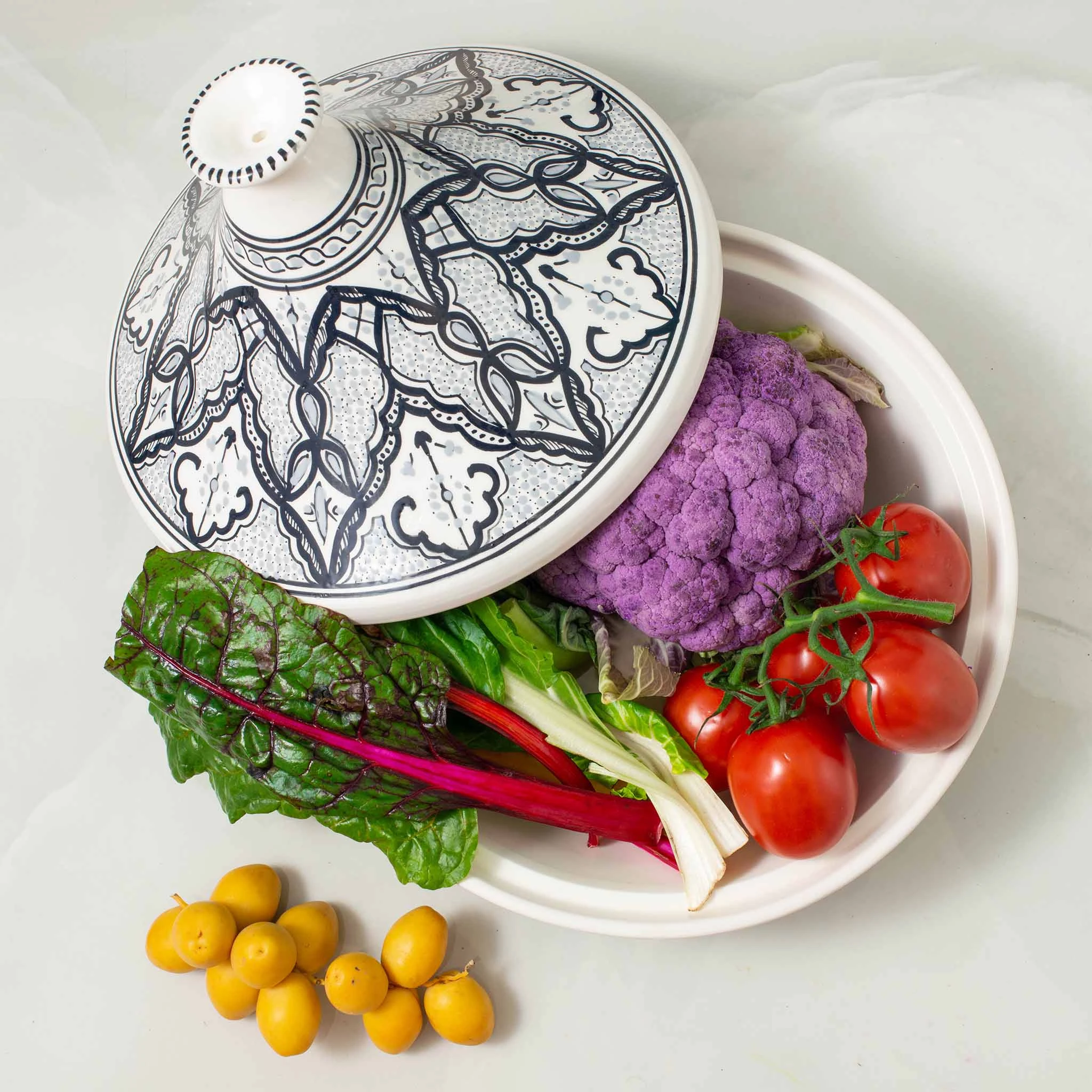Use the alyasamin patterned tagine to cook the North African classic at home. This striking oven-to-table stew pot is designed for cooking and presenting tagines. Decorated with intricate patterns in deep shades of grey and black, this pot is both beautiful to look at and practical to use.Â