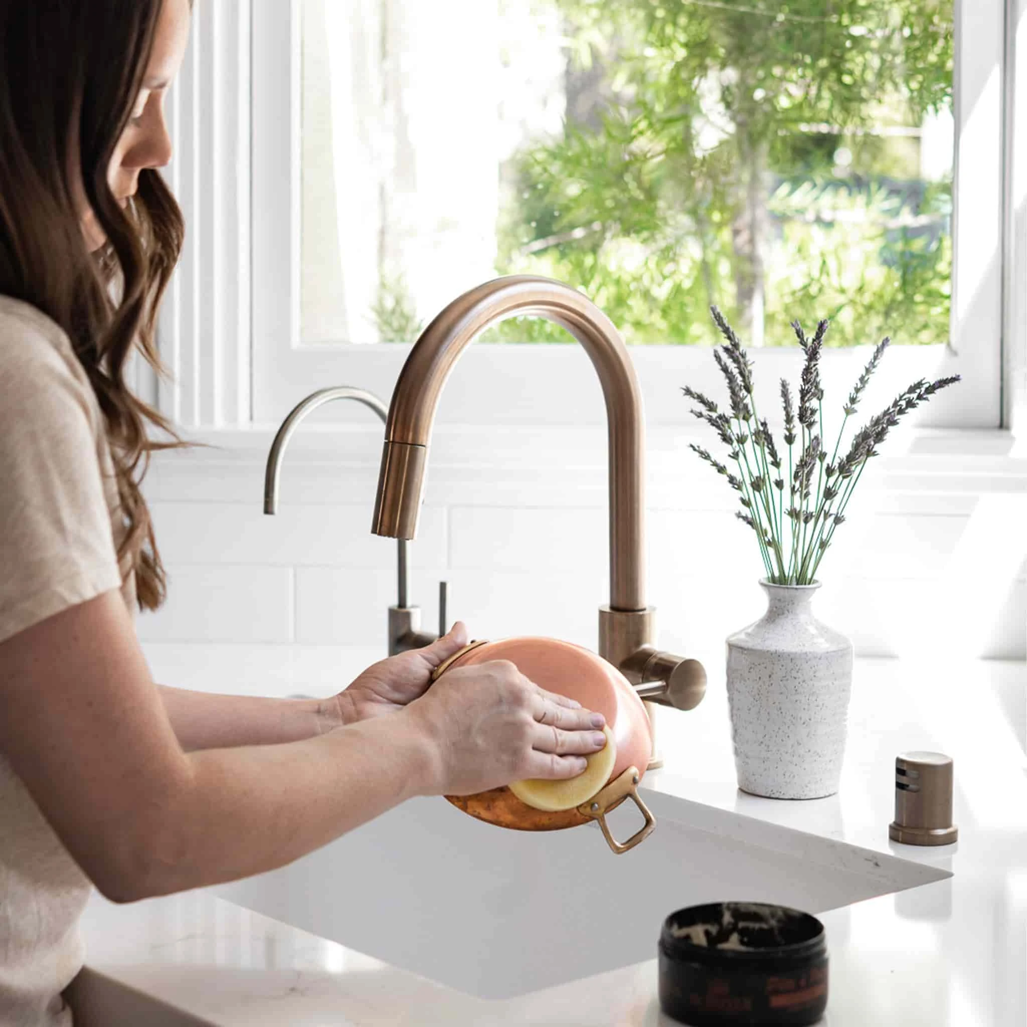 De Buyer copper cleaner restores the glowing shine to copper cookware in an instant. The polishing paste is very easy to use – simply rub onto your copper pans, kettle or bowls with a warm damp sponge and rub the copper in small circles. You’ll see imperfections and stains lift off straight away. Finish by rinsing and drying the copper, and rubbing down with a clean tea towel.