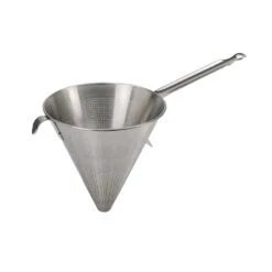 The De Buyer stainless-steel chinois with 1.5mm mesh is an excellent utensil for straining soups, sauces and gravies. Also known as a conical strainer or Chiense strainer, it removes large pieces of food or fish bones from stock, or whole herbs and spices from soups for smooth results.