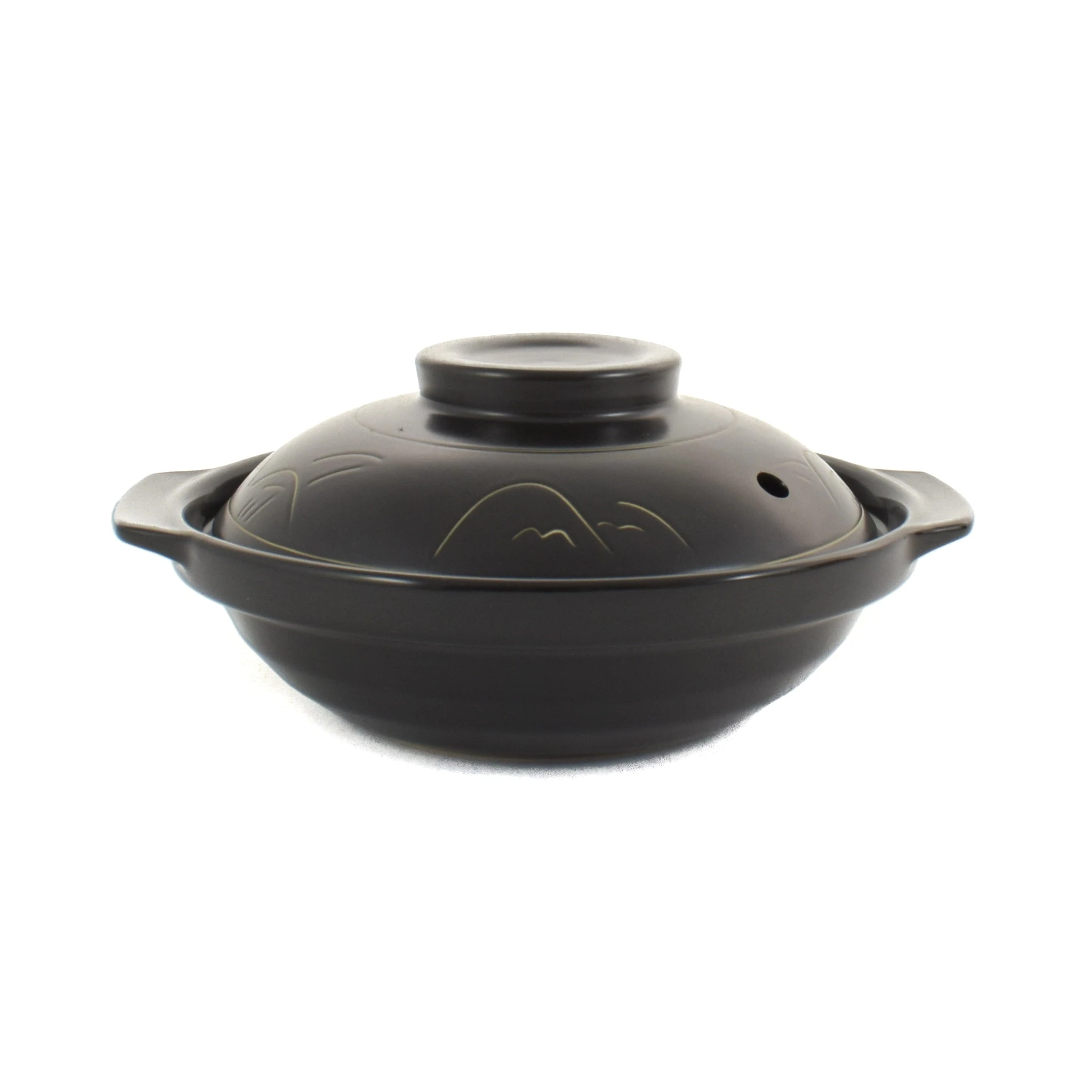 Donabe (‘earthenware pot’ in Japanese) are pots made from a type of clay so sturdy, that it can sit over an open flame. Measuring 18cm, this durable clay pot – with simple decoration on top – can be used for stews, hot pots and rice bowls.
