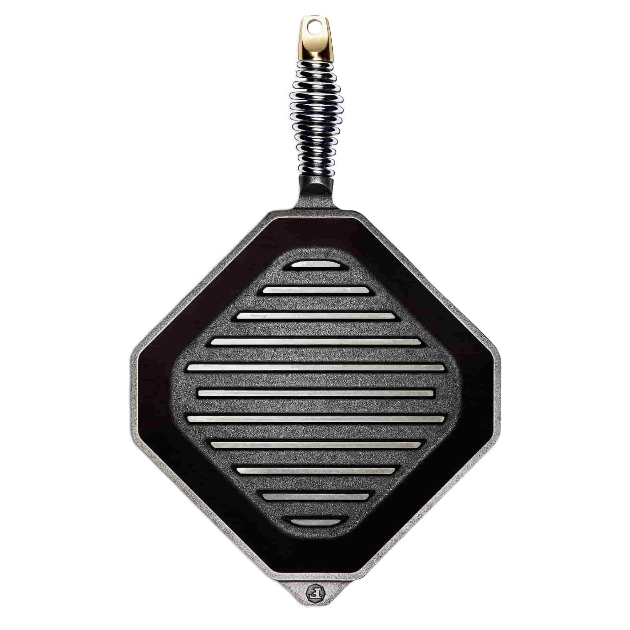 The pan features a unique diamond shape that makes it easy to pour away excess fat and juices. It also has a coiled stainless steel handle that stays cool while you grill so you can easily move it from your stove to a heat resistant mat on your countertop.Â
