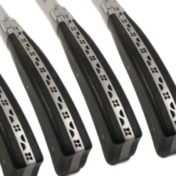 The Laguiole en Aubrac set of 4 full handle American steak knives with ebony handles lets you effortlessly slice perfect pieces of ribeye, tenderloin and strip. The smooth 14cm blade on these knives prevents tearing of the meat, leaving you with perfect slices, every time.Â