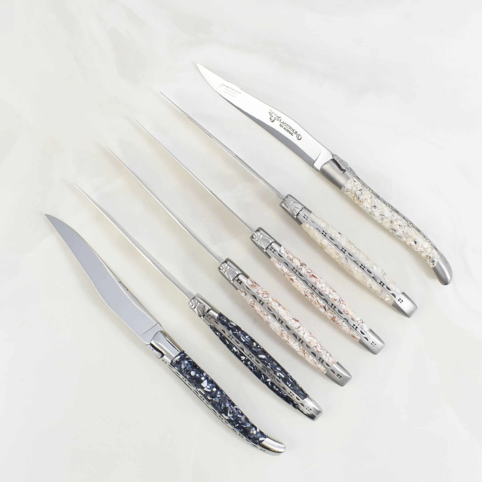 The handles are made from recycled mollusc shells which are finely crushed and compacted with transparent resin. This gives them a smooth, satin finish that feels great in your hand and looks fantastic on your table. This mixed set features handles made with mussel, scallop and oyster shells – there are two of each type.