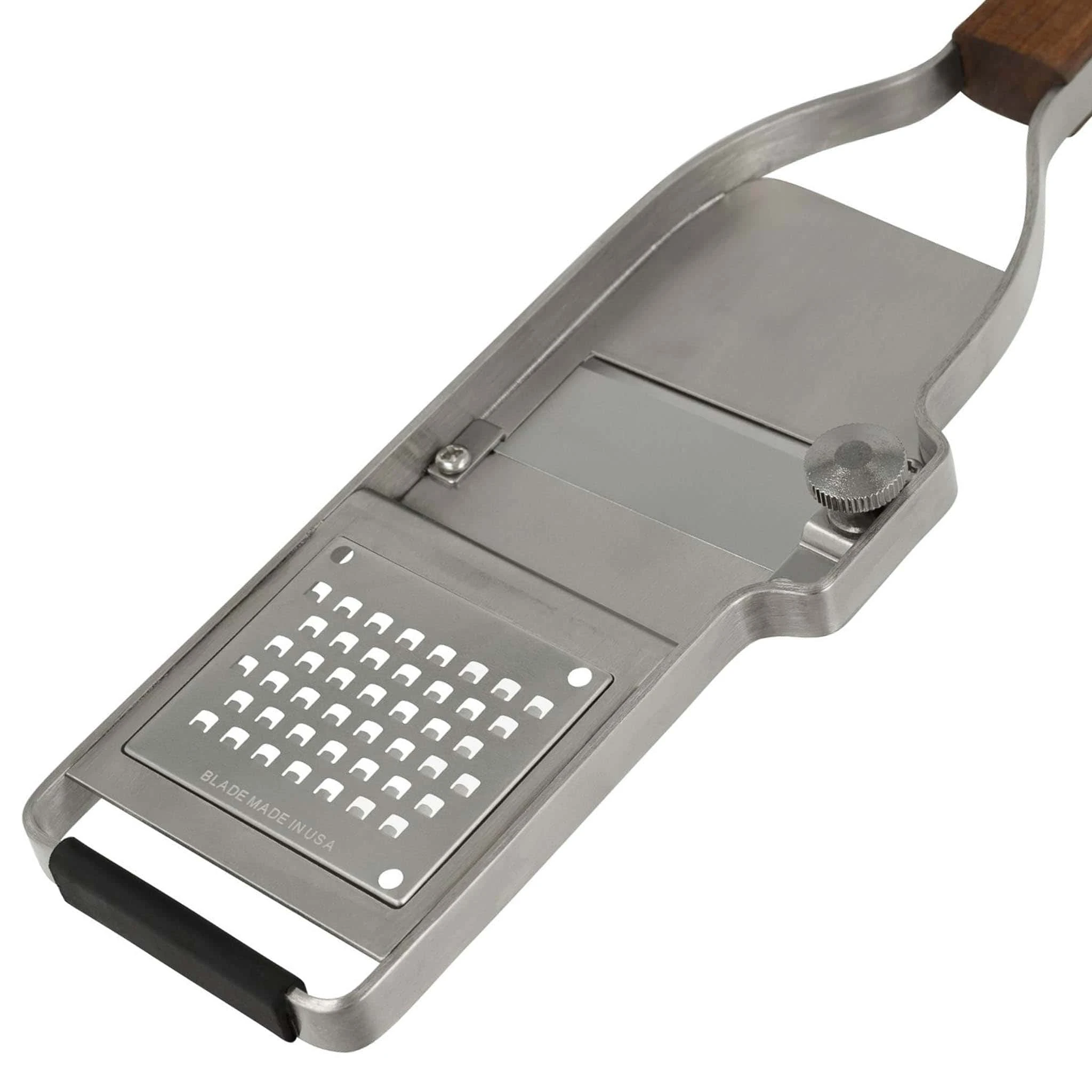 This stainless steel gadget has a smart walnut handle, and a non-slip rubber foot for stability while grating.