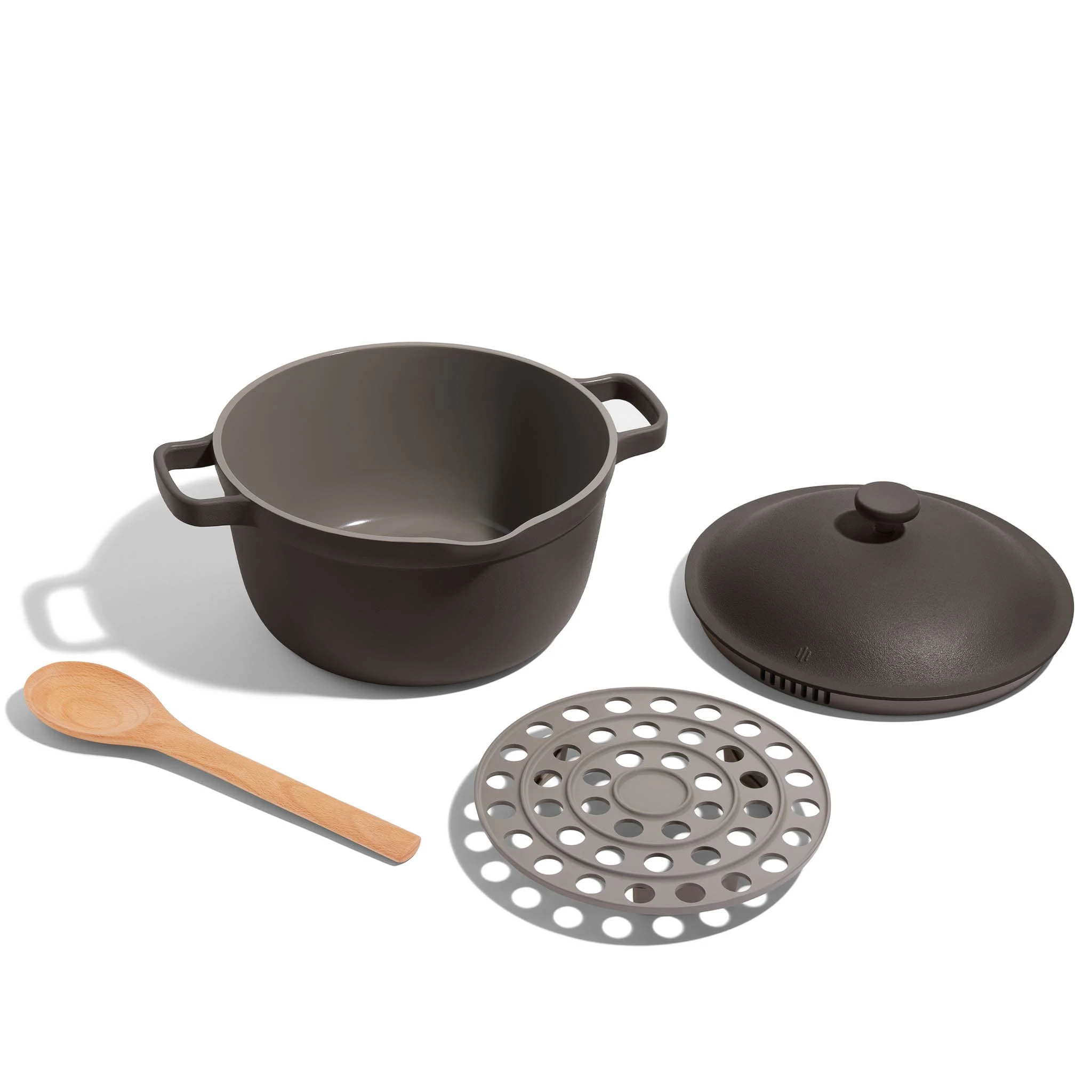 Care for your Perfect Pot by washing it by hand once cooled. It can be deep cleaned with boiling water and baking soda. Avoid scouring pads, abrasive cleaning agents and metal utensils.